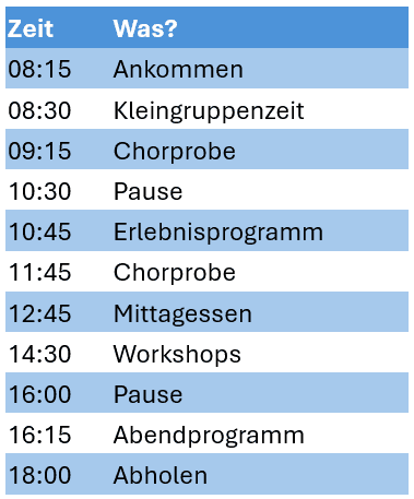 Am Vormittag wird gemeinsam mit dem Chor geübt und am Nachmittag geht man zu einem der Workshops für die man sich angemeldet hat. (Solo, 2 Stimme, Theater, Gebärdensprache, Tanz oder zum Basteln)